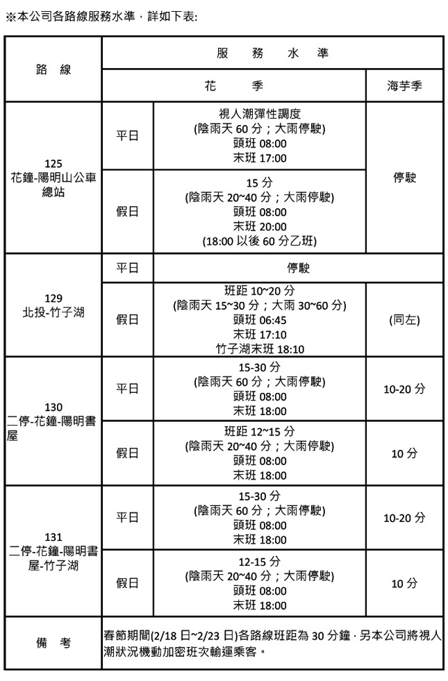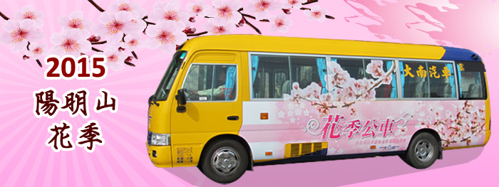 本公司為加強服務春節民眾上山賞花需求,該公司已彩繪多輛櫻花、海芋主題公車,大南汽車公司將派遣服務人員,於捷運北投站、花鐘及陽明山第二停車場等重要據點協助引導乘客上、下車及提供相關諮詢服務。大南汽車公司誠摯歡迎市民大眾,多多利用大眾運輸工具上山賞花。